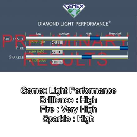 GemEx®以光學專利的儀器 BrillianceScope 分析儀為鑽石進行了測量,從亮度(Brilliance)、火彩(Fire)、閃爍度(Sparkle)評估鑽石的光學效應。並且將這三重指標劃分為四個等級:低(Low),中(Medium),高(High),很高(Very high)。