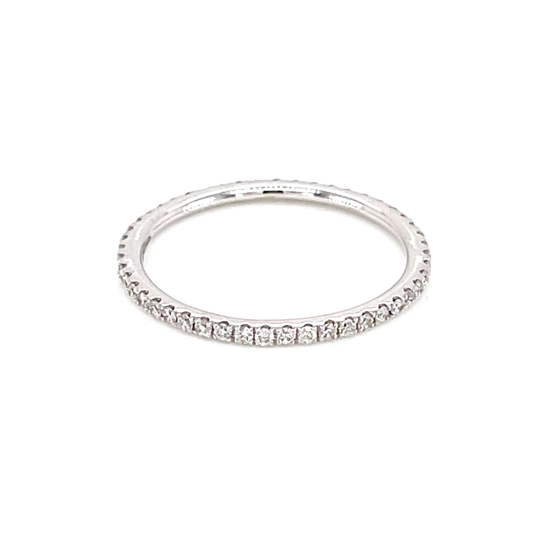 18K白金滿鑽戒指,輕巧幼身指環鑲滿48粒共0.33卡閃爍碎鑽,可單獨配戴或加入其他戒指一同疊戴,永續時尚百搭款式。 Ref#38984A