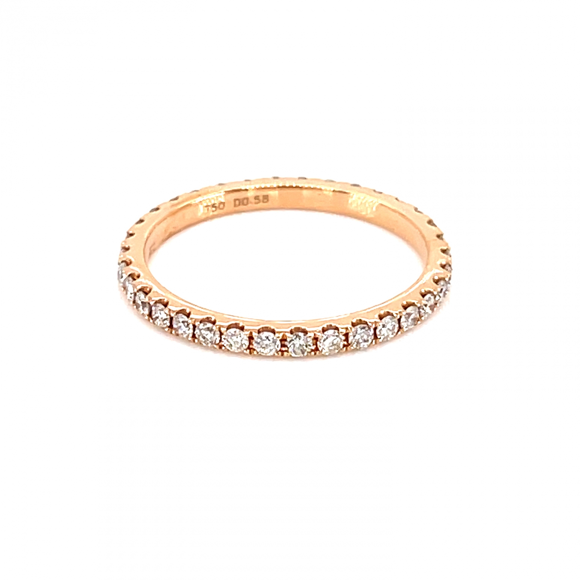 18K玫瑰金滿鑽戒指,輕巧幼身指環全圈鑲滿34粒共0.58卡閃爍碎鑽,可單獨配戴或加入其他戒指一同疊戴,永續時尚百搭款式。Ref#R4331