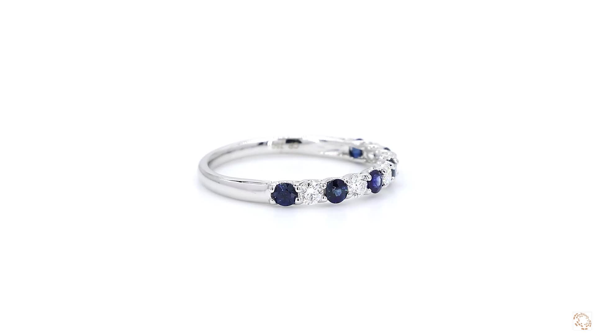 18K白金半圈排戒,以相間方式鑲滿藍寶石6粒共0.41卡和白鑽5粒共0.23卡。