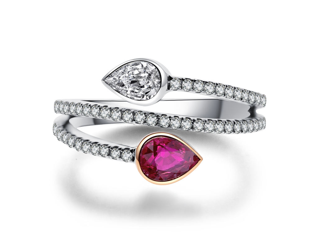 鑽石與紅寶石的雙色設計,加入排鑽的元素,呈現出嶄新的樣式,點綴生活色彩,適合日常配戴。
